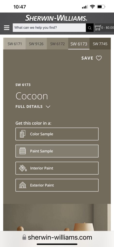 After many, many samples and scouring the internet I have decided on paint colors!! I am using Cocoon by Sherwin-Williams on the main cabinets and pantry. I am using Ethereal Mood (also by SW) on the island and fireplace.